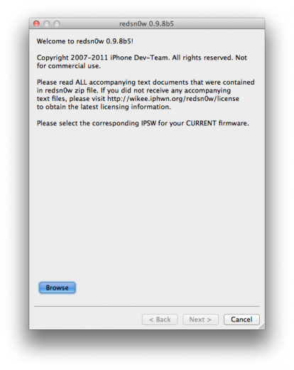 Per una semplice guida per eseguire il jailbreak con RedsnOw vi rimando a questo articolo. L’unica differenza è che quando cliccate su Browse dovrete selezionare il file .ipsw relativo ad iOS 5.0 beta 5.