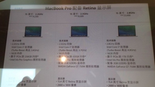 Sembra che il nuovo modello da 15 pollici del Macbook Pro Retina sarà dotato dei processori Intel Haswell di ultima generazione, e la configurazione standard prevederà ben 16 GB di memoria RAM. I prezzi dovrebbero rimanere invariati, visto che il sito cinese parla di un price-tag attorno ai 14.288 – 18.688 Yuan.