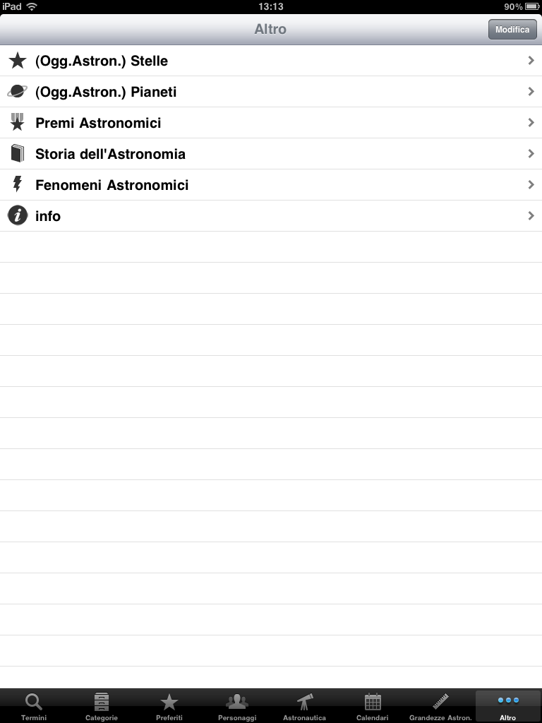 In “Categorie” sono presenti le misure, gli orologi, i luoghi e tutto ciò che riguarda il mondo dell’astronomia divisa per categorie precise.