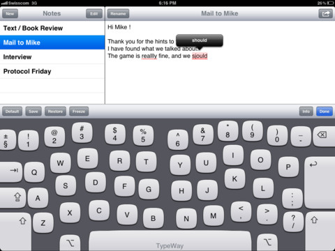 L’iPad sta sempre più diventando uno strumento molto utile per la produttività, e molte persone si ritrovano a scrivere i propri documenti, i propri tasti, i propri articoli (questo che state leggendo, ad esempio) sul proprio iPad e non sulla ben più comoda tastiera di un computer. I vantaggi di un iPad ci sono, e soprattutto sono riassumibili nell’indipendenza quasi totale dalla corrente elettrica e nella portabilità: tuttavia non sempre scrivere su iPad risulta così comodo, e per questo ci viene in aiuto un utile programma dal nome Typeway.